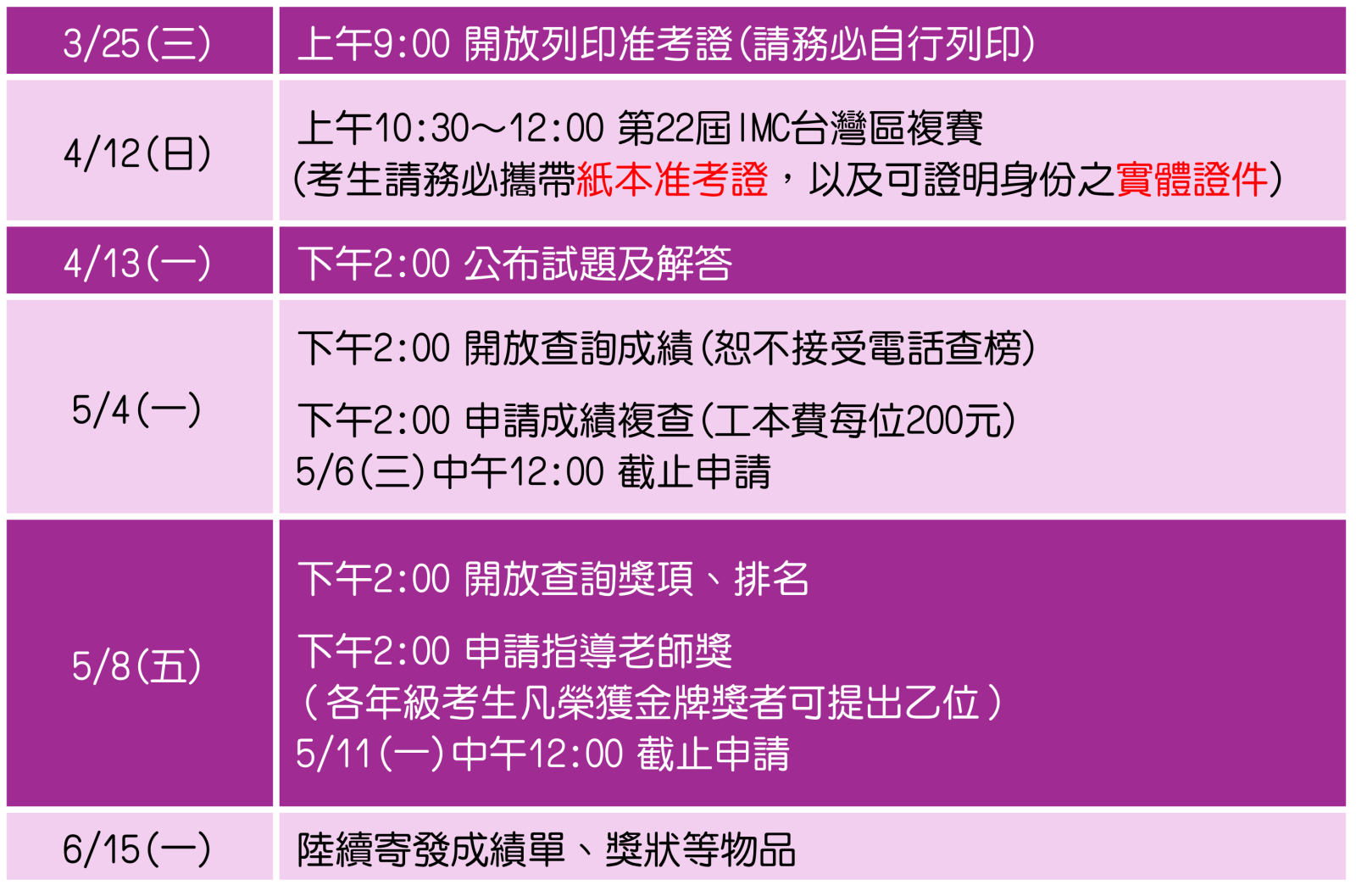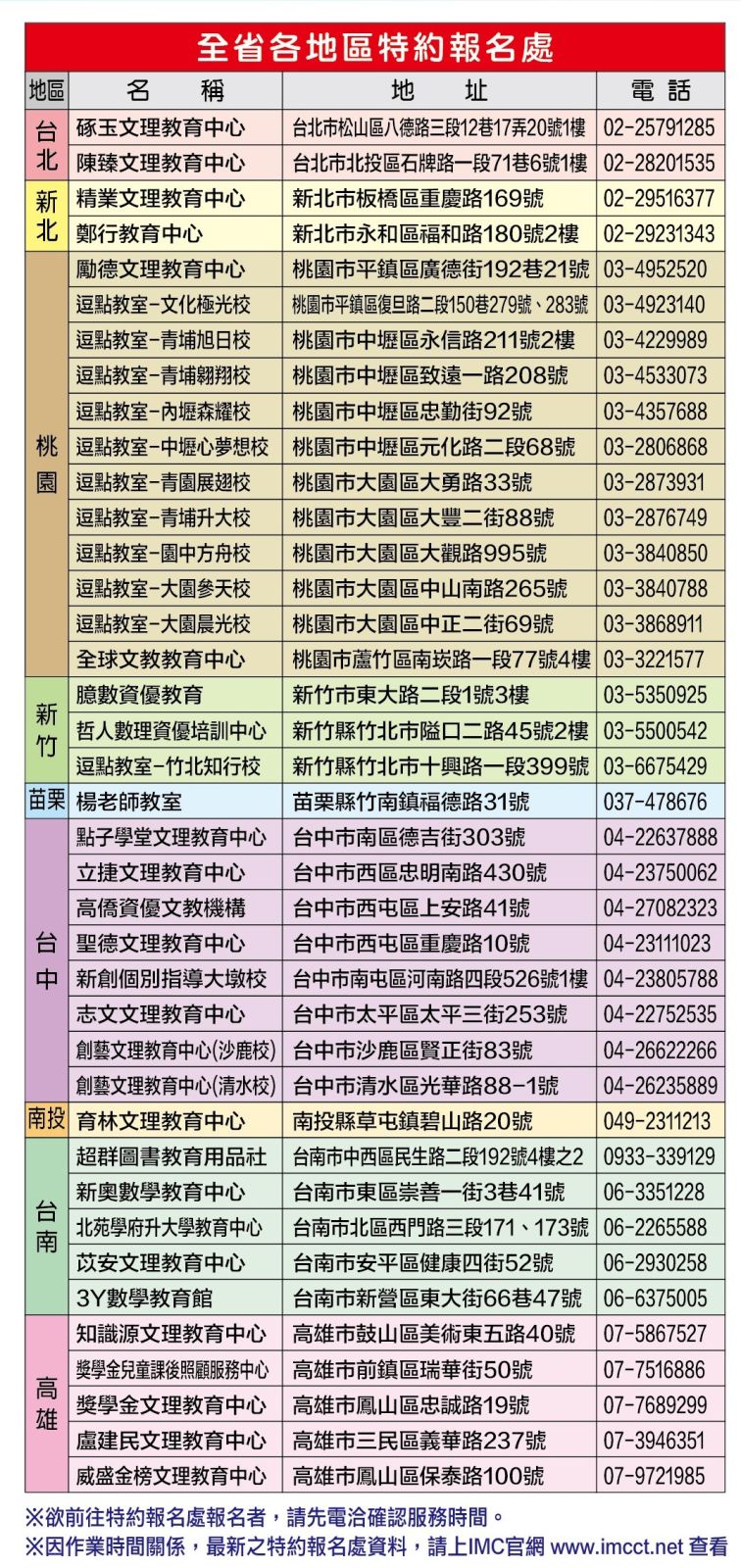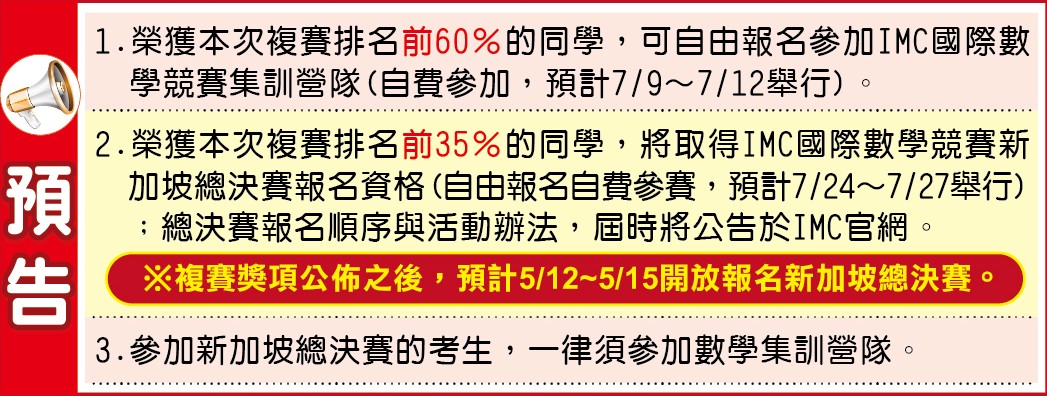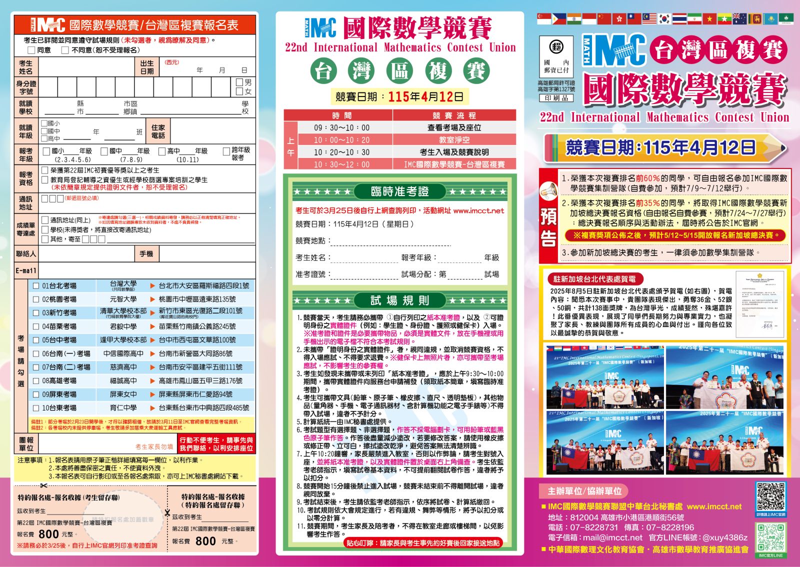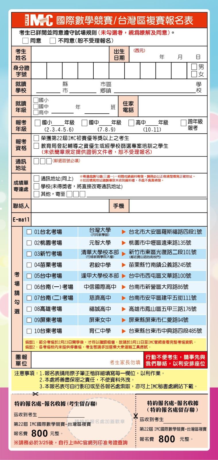 一、報名方式及時間(請擇一報名方式,勿重複報名): 1.網路報名:2/27(五)下午13:00~3/16(一)晚上23:59止 【進入個人線上報名系統】 繳費說明 (1)繳費系統會針對每張繳費單編訂一個虛擬的繳款帳號(銷帳編號)。 (2)限台灣銀行臨櫃繳款或ATM、網路銀行轉帳,未受理超商繳費。 (3)完成繳費後,請登入報名查詢系統確認繳費狀態(無須致電確認)。 (4)繳費期限至3/17(二)晚上23:59止,逾期恕不受理。 ------------------------------------------ 2.報名處報名:2/27(五)~3/16(一)止 【進入團體單位報名系統】僅開放團體單位使用 【全省各地區特約報名處查詢】 二、報考資格(須符合其中一項,經審查不符資格者,恕不受理報名): (1)榮獲第22屆IMC初賽優等獎以上之考生。 (2)教育局登記輔導之資優生或經學校專案培訓之學生(未提供證明者,將取消報名)。【資優證明表下載】或【線上電子表單上傳】 三、報考年級: 分年級競賽,國小二年級至高中二年級(可跨年級參賽)。 四、報名費用: 每位考生800元,凡報名並完成繳費手續者,即贈送一本歷屆試題本。 報名贈品(歷屆試題本) (1)網路報名:經本處確認已完成繳費者,將於7個工作天內(不含假日)以印刷物寄出題本。 (2)報名處報名:於報名處現場完成報名繳費者,將由報名處現場發贈題本,但仍需視報名處題本庫存量而定。 五、競賽試題: 試題範圍以該學年學習課程為主,加深並加廣活用,3至11年級加入英文題型(約占10~20%)。非電腦劃卡作答,採人工閱卷批改。 六、考場資訊: ![]() 七、競賽相關日程表: ![]() 八、活動預告: ![]() 下載專區 第22屆IMC複賽-簡章正面 第22屆IMC複賽-簡章背面 第22屆IMC複賽-報名表 |