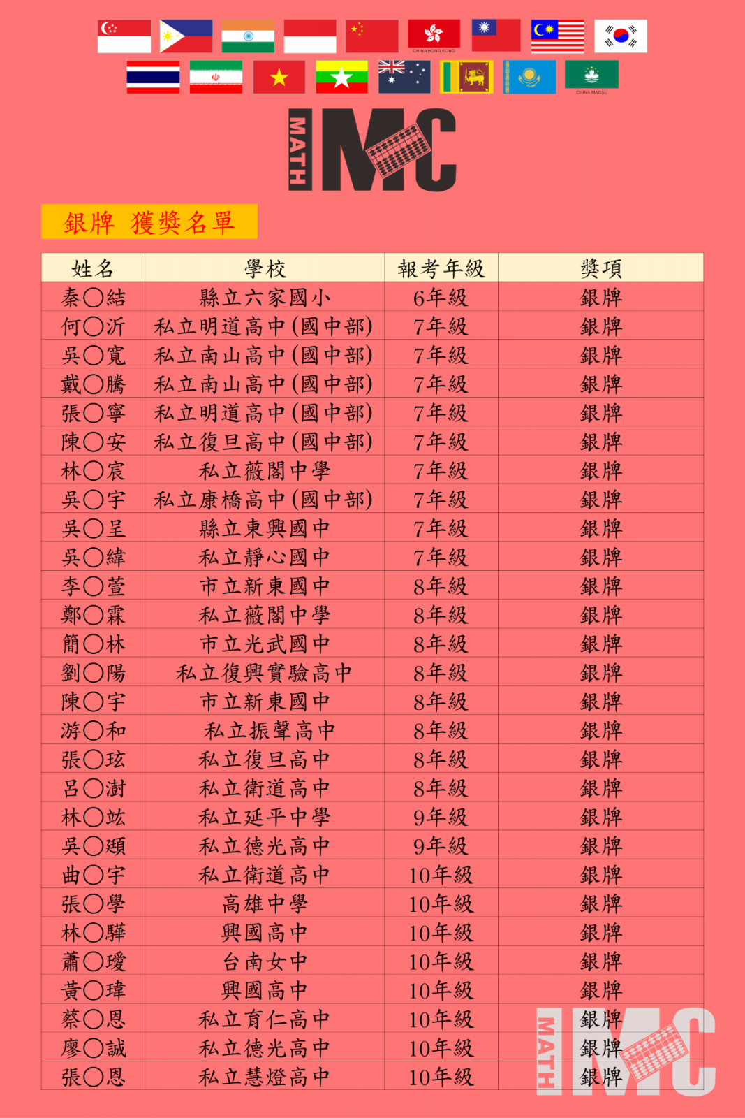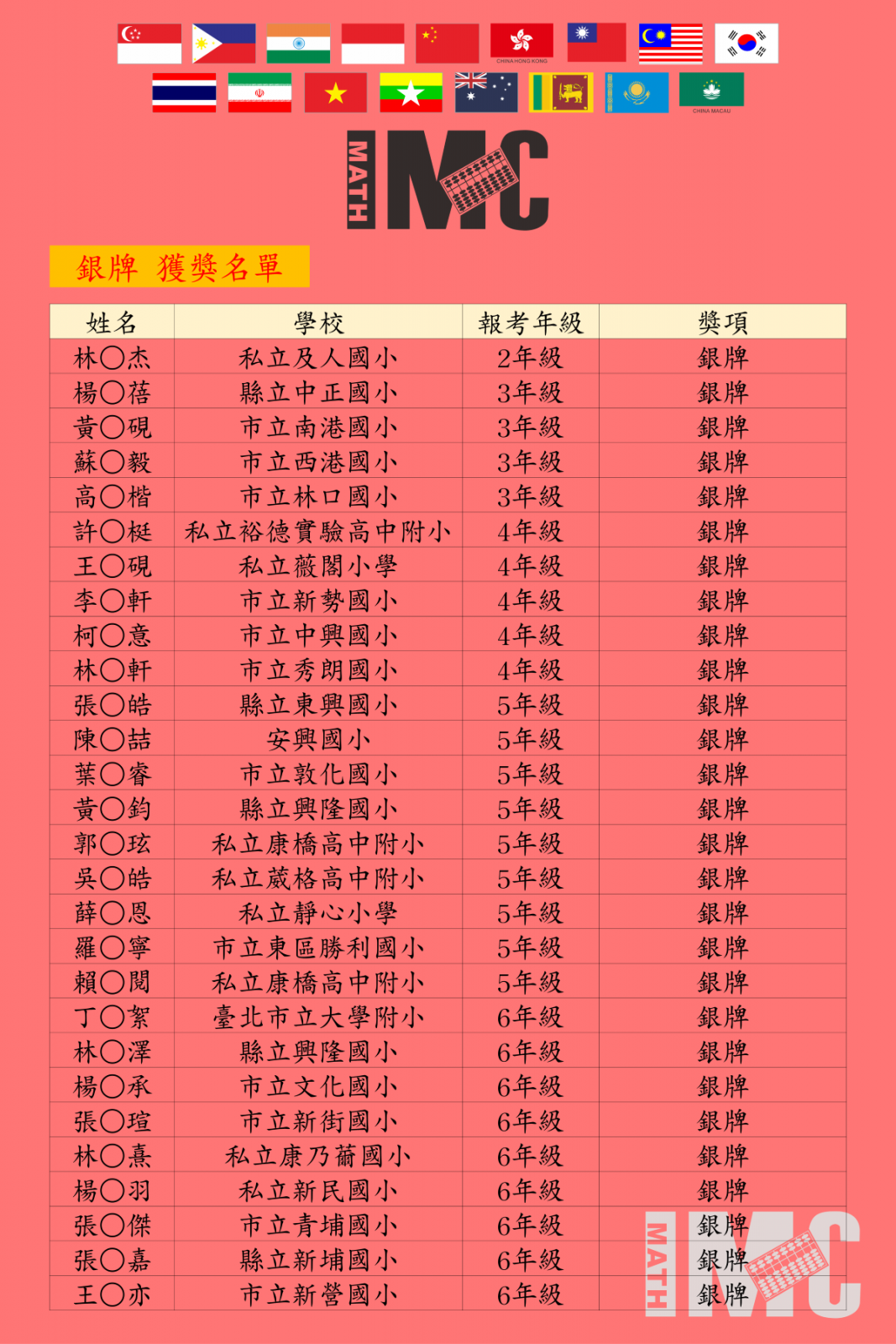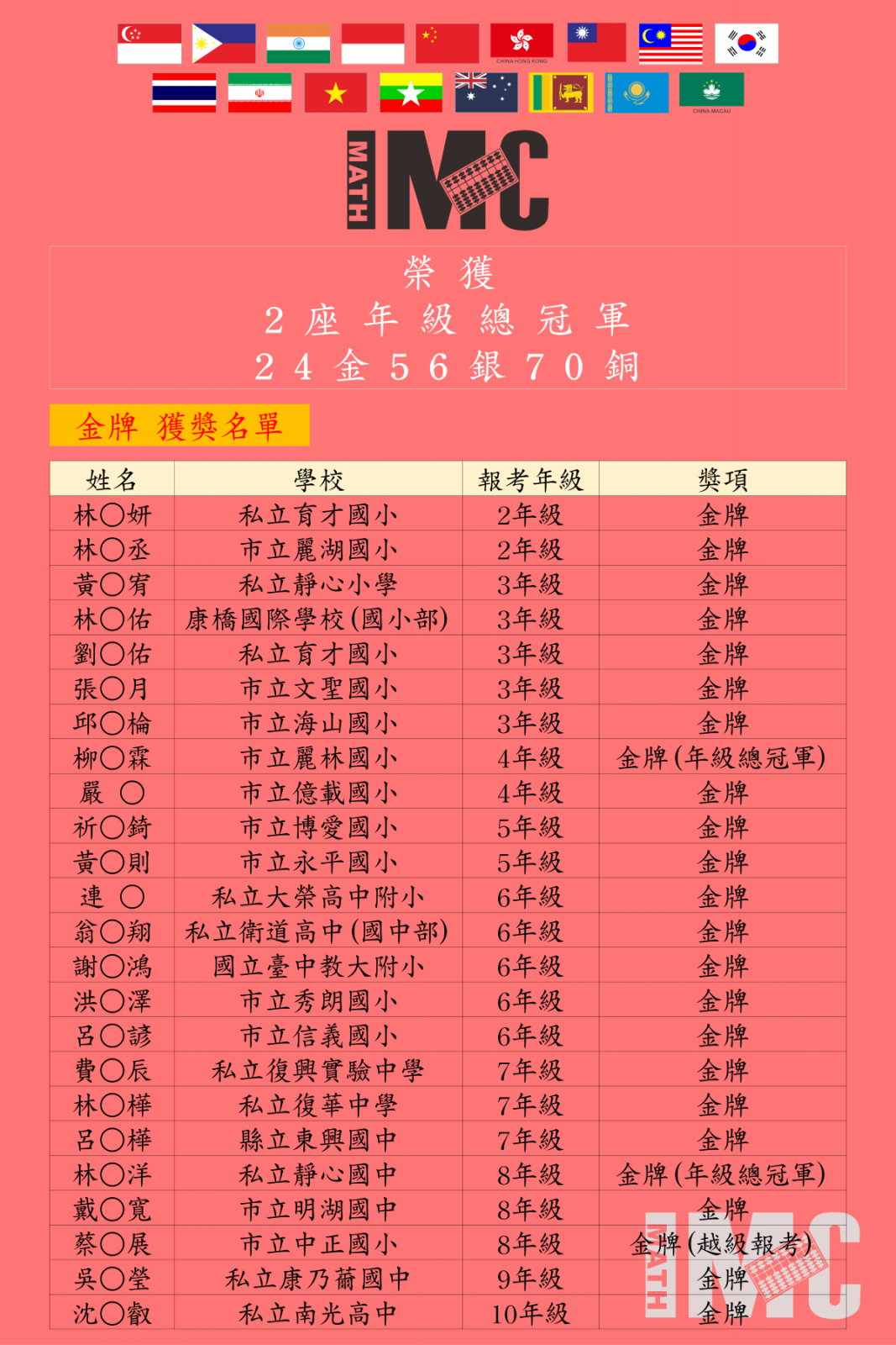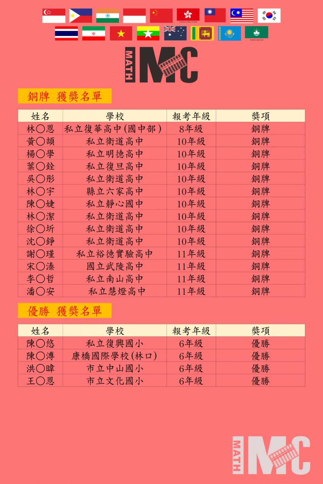 【決賽】第20屆IMC國際數學競賽新加坡決賽得獎榜單