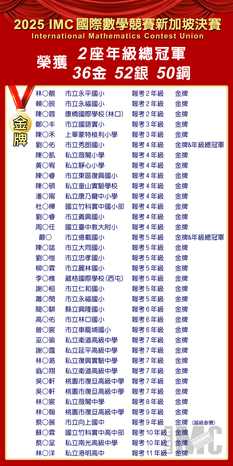 【決賽】第21屆IMC國際數學競賽新加坡決賽得獎榜單