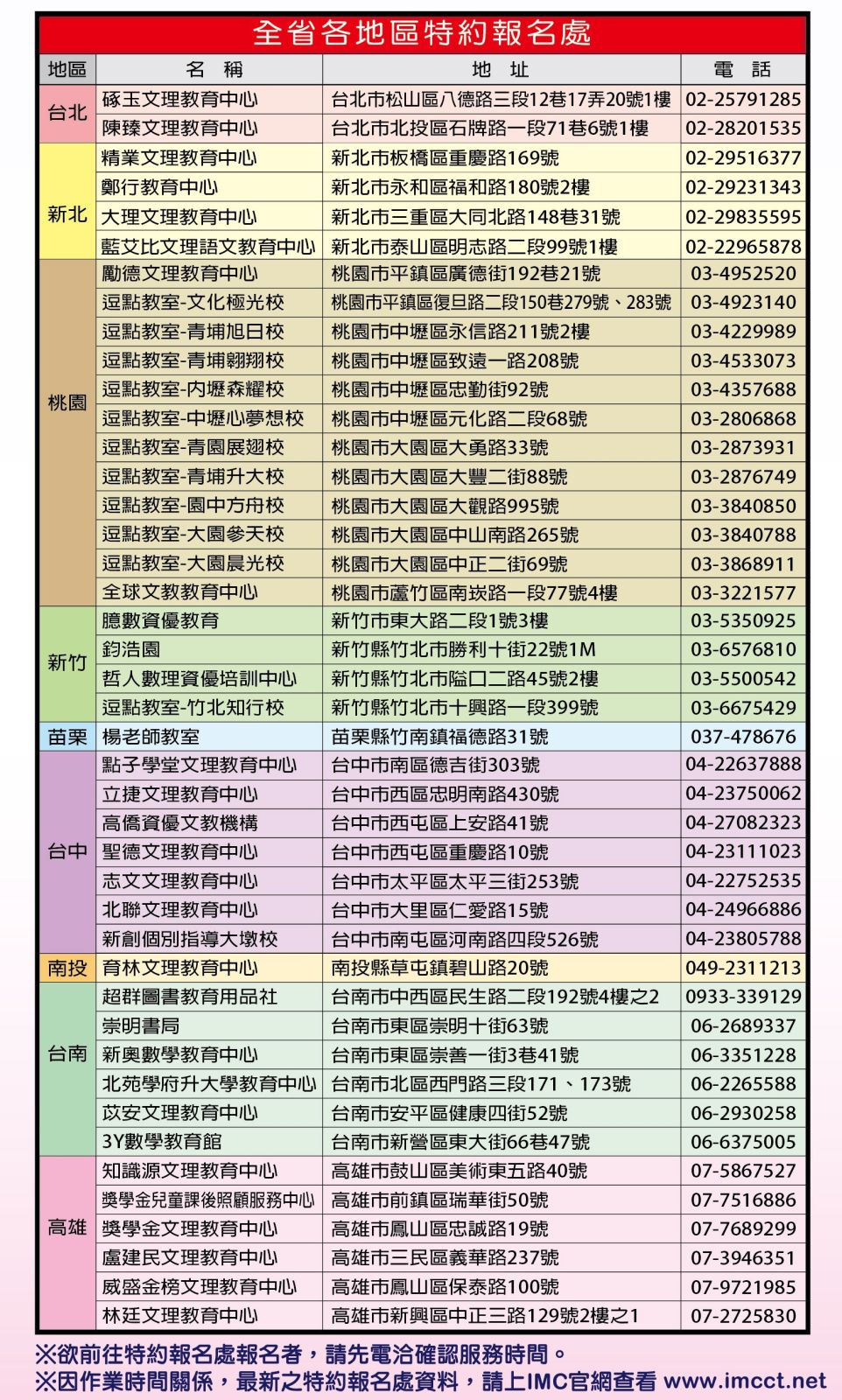 競賽時間:114年11月30日(星期日)上午10:20~11:30 一、報名方式及時間(請擇一報名方式,勿重複報名): 1.網路報名:10/7(二)下午13:00~11/4(二)晚上23:59止 【進入個人線上報名系統】 繳費說明 (1)繳費系統會針對每張繳費單編訂一個虛擬的繳款帳號(銷帳編號)。 (2)限台灣銀行臨櫃繳款或ATM、網路銀行轉帳,未受理超商繳費。 (3)完成繳費後,請登入報名查詢系統確認繳費狀態(無須致電確認)。 (4)繳費期限至11/5(三)晚上23:59止,逾期恕不受理。 ------------------------------------------ 2.報名處報名:10/7(二)~11/5(三)止 【進入團體單位報名系統】僅開放團體單位使用 【全省各地區特約報名處查詢】 新增特約報名處 創藝文理教育中心(沙鹿校) 台中市沙鹿區賢正街83號 04-26622266/04-26622267 創藝文理教育中心(清水校) 台中市清水區光華路88-1號 04-26235889/04-26235880 二、報考年級: 分年級競賽,國小一年級至高中二年級(可跨年級參賽)。 三、報名費用: 每位考生800元,凡報名並完成繳費手續者,即贈送一本歷屆試題本。 報名贈品(歷屆試題本) (1)網路報名:經本處確認已完成繳費者,將於7個工作天內(不含假日)以印刷物寄出題本。 (2)報名處報名:於報名處現場完成報名繳費者,將由報名處現場發贈題本,但仍需視報名處題本庫存量而定。 四、競賽試題: 考試內容為該上學年學習課程,以及該學年第一學期第一次月考範圍為主,3至11年級加入英文題型(約占10~20%)。非電腦劃卡作答,採人工閱卷批改。 五、考場資訊: ★新竹考場位置說明★ 清華大學「竹師教育學院」自114年8月底已從南大校區搬遷至校本部(近寶山路的南校門),詳細考場地址資料如下表(簡章)所示,請考生不要跑錯校區【位置圖查詢】。 ★台中考場異動公告★ 原考場東海大學更改至「逢甲大學校本部(忠勤樓)」,台中市西屯區文華路100號。 ![]() 六、競賽相關日程表: ![]() 下載專區 第22屆IMC初賽-簡章正面 第22屆IMC初賽-簡章背面 第22屆IMC初賽-報名表 |